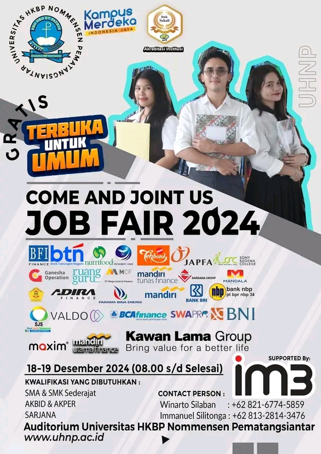 Pematangsiantar, GM – Universitas HKBP Nommensen Pematangsiantar akan menyelenggarakan job fair 2024, Informasi ini dibagikan melalui akun media sosial (medsos) instagram @uhkbpnpematangsiantar.